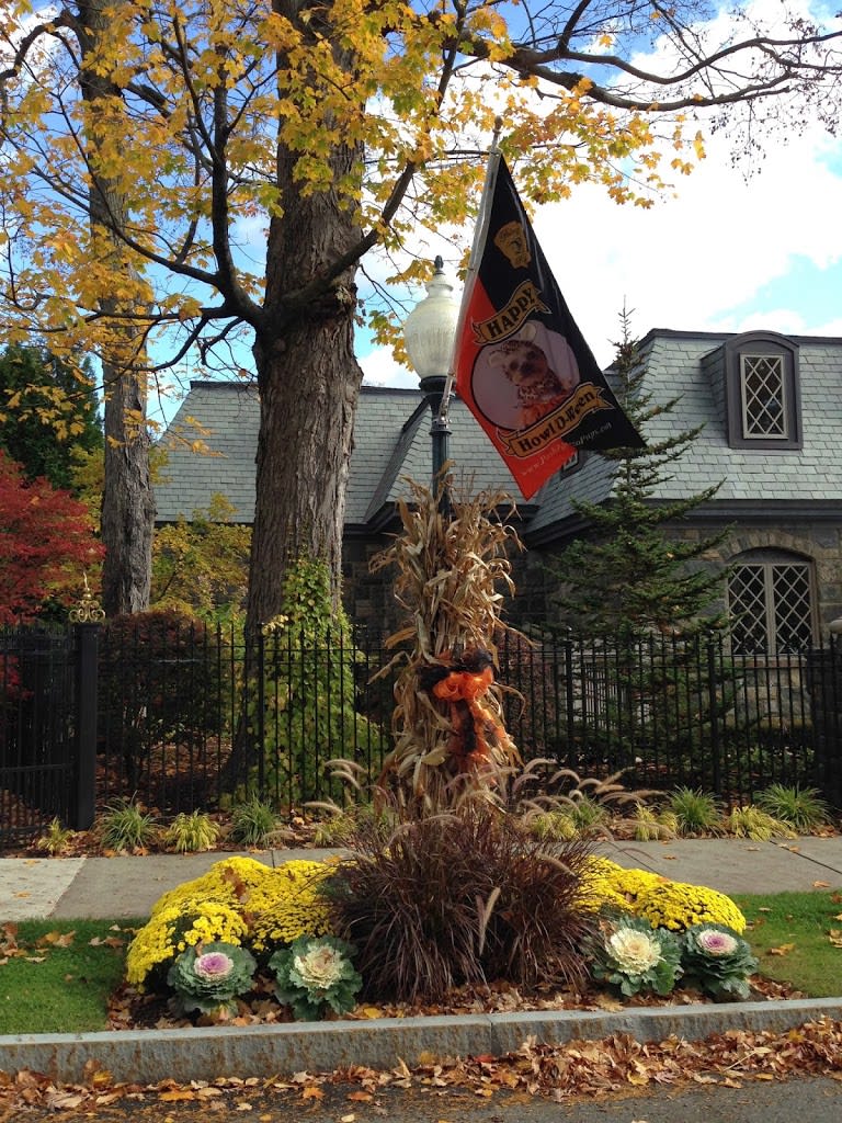 The decorations didn’t stop curbside. The fall theme was carried right out to the street with street lamps wrapped and cabbage roses and mums at the base. The home is located on Broadway, a main street in Saratoga and on a corner. Both sides of the house that face streets are decorated, the photo below is the side of the house that faces Greenfield Ave.